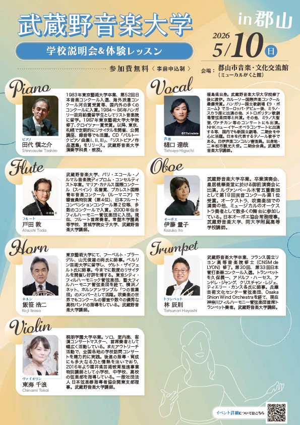 【5月10日(日)】武蔵野音楽大学 学校説明会&体験レッスン 福島県郡山市